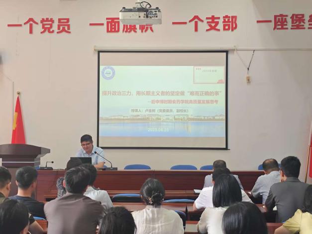 2025年6月25日下午,副校长卢金树在海科楼141报告厅讲授了题为《提升政治三力,用长期主义者的坚定做“难而正确的事”——后申博时期食药学院高质量发展思考》的专题党课,60多名教职工听讲了此次党课。