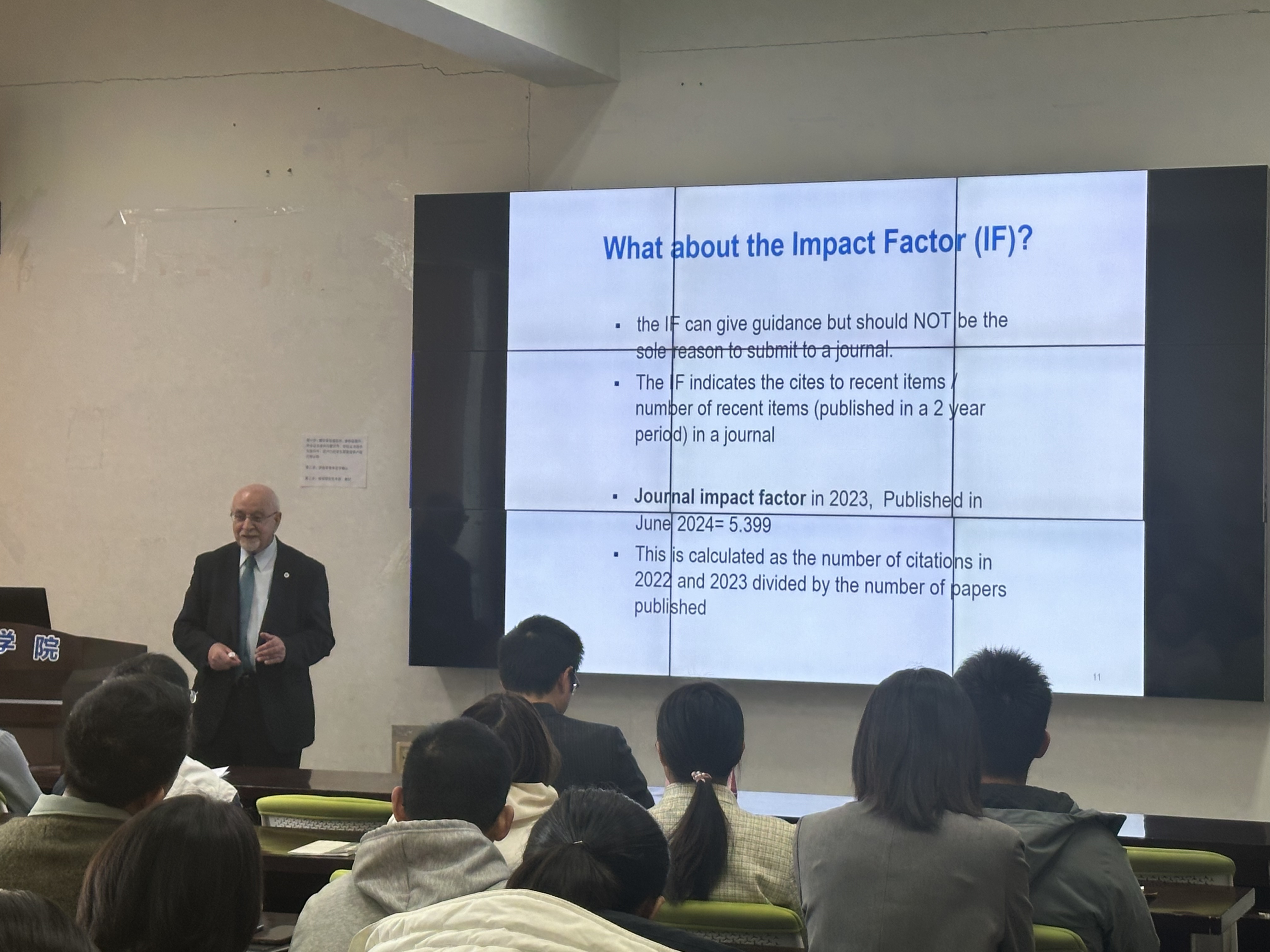 讲座中,费雷顿·谢希迪教授详细阐述了撰写科研论文的各方面细节,从注意语句表达的句式、时态、语法,到选择合适的期刊、遵守期刊作者指南,再到文章各部分的注意点、常见问题、如何修订,最后费雷顿·谢希迪教授通过一系列学术不端案例,着重强调坚守学术诚信底线的重要性。在互动环节,费雷顿·谢希迪教授耐心回答了师生们提出的问题,给出了许多宝贵建议,他的真诚和专业赢得在场师生的阵阵掌声。